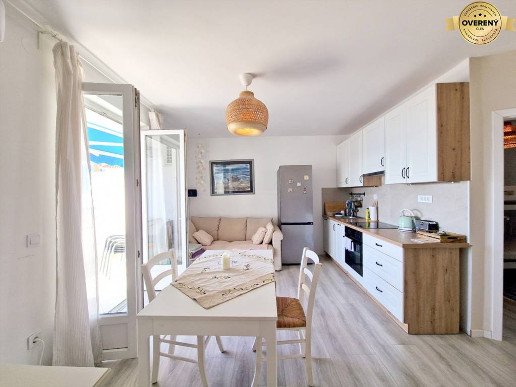 Die Wohnung verfügt über eine Küche mit Wohnzimmer und Zugang zur Terrasse, zwei Schlafzimmer und ein Badezimmer.