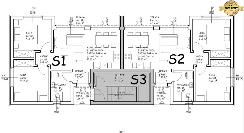 Ein kleines Mehrfamilienhaus mit drei Wohnungen befindet sich derzeit im Bau. Zum Verkauf stehen die Erdgeschosswohnungen S1 und S2. Beide Wohnungen haben die gleiche Fläche und den gleichen Grundriss: