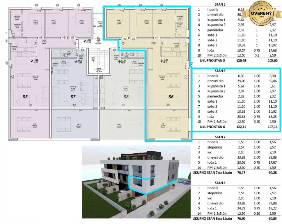 Wohnung S6 befindet sich im 1. Obergeschoss. Sie verfügt über eine Wohnfläche von 89,38 m² zuzüglich einer schönen, großzügigen, überdachten Terrasse von 20,33 m² mit Panoramablick auf das Meer. Zur Wohnung gehört ein Parkplatz.
