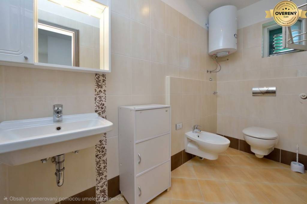 Die Wohnung befindet sich im 1. Stock eines kleineren Mehrfamilienhauses, 80 m vom Meer entfernt. Der Sandstrand Bilotinjak ist 400 m entfernt.