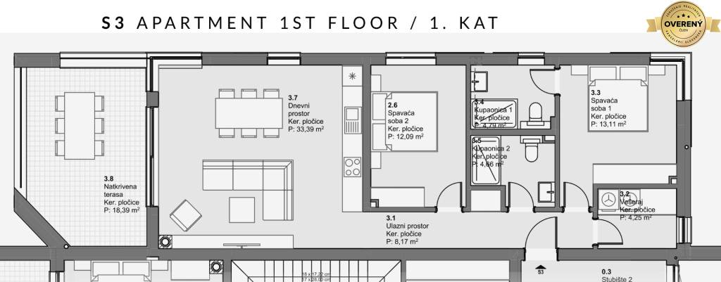 Wohnung S3 – eine 3-Zimmer-Wohnung im 1. Stock.